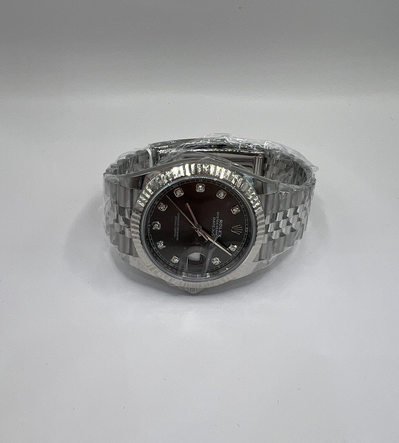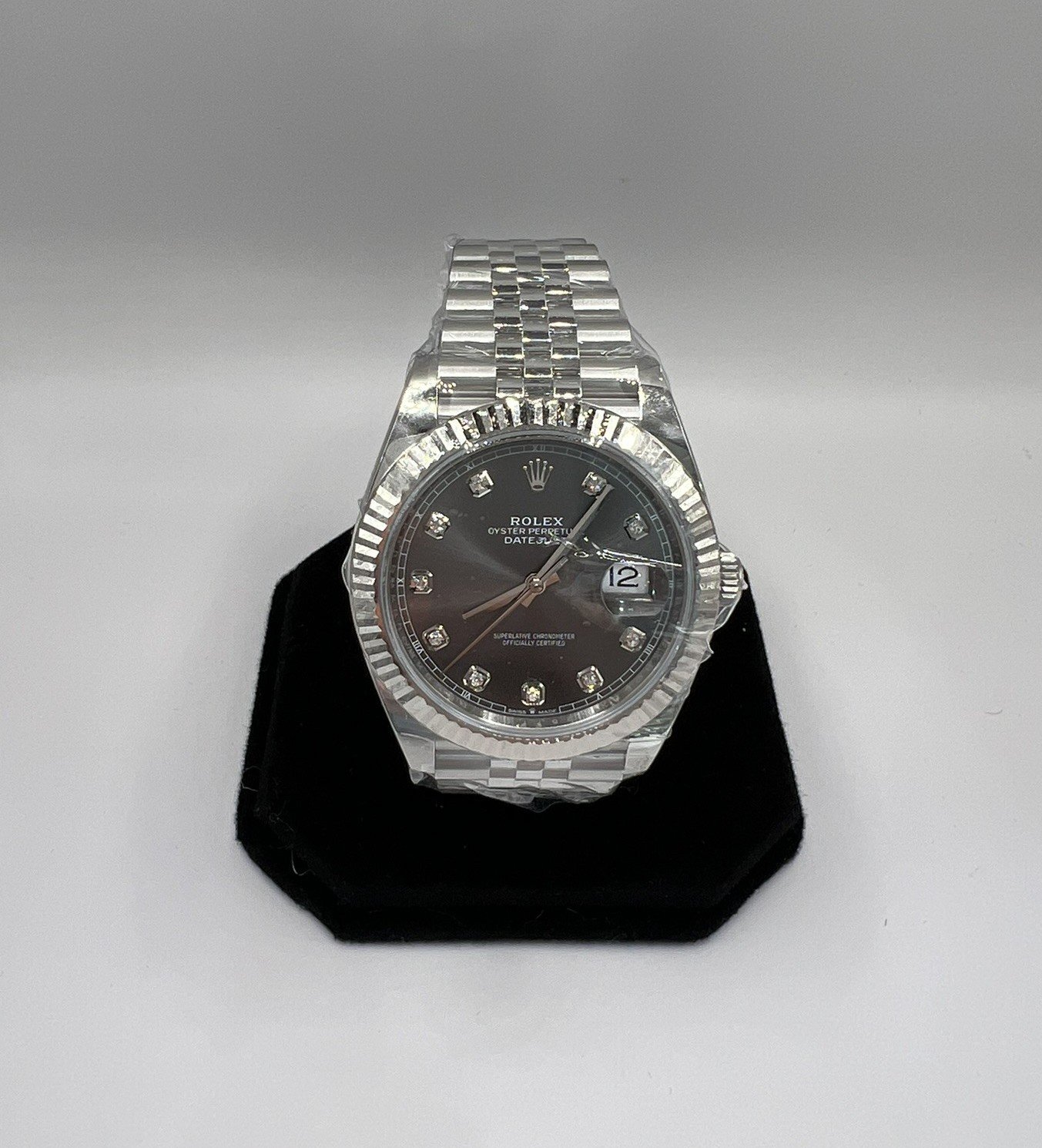 This is a Rolex Datejust featuring an elegant rhodium grey dial adorned with diamond hour markers, paired with the signature Jubilee bracelet. Its understated yet refined aesthetic comes complete with Rolex’s fluted bezel in white gold. A perfect blend of luxury and timeless design.
